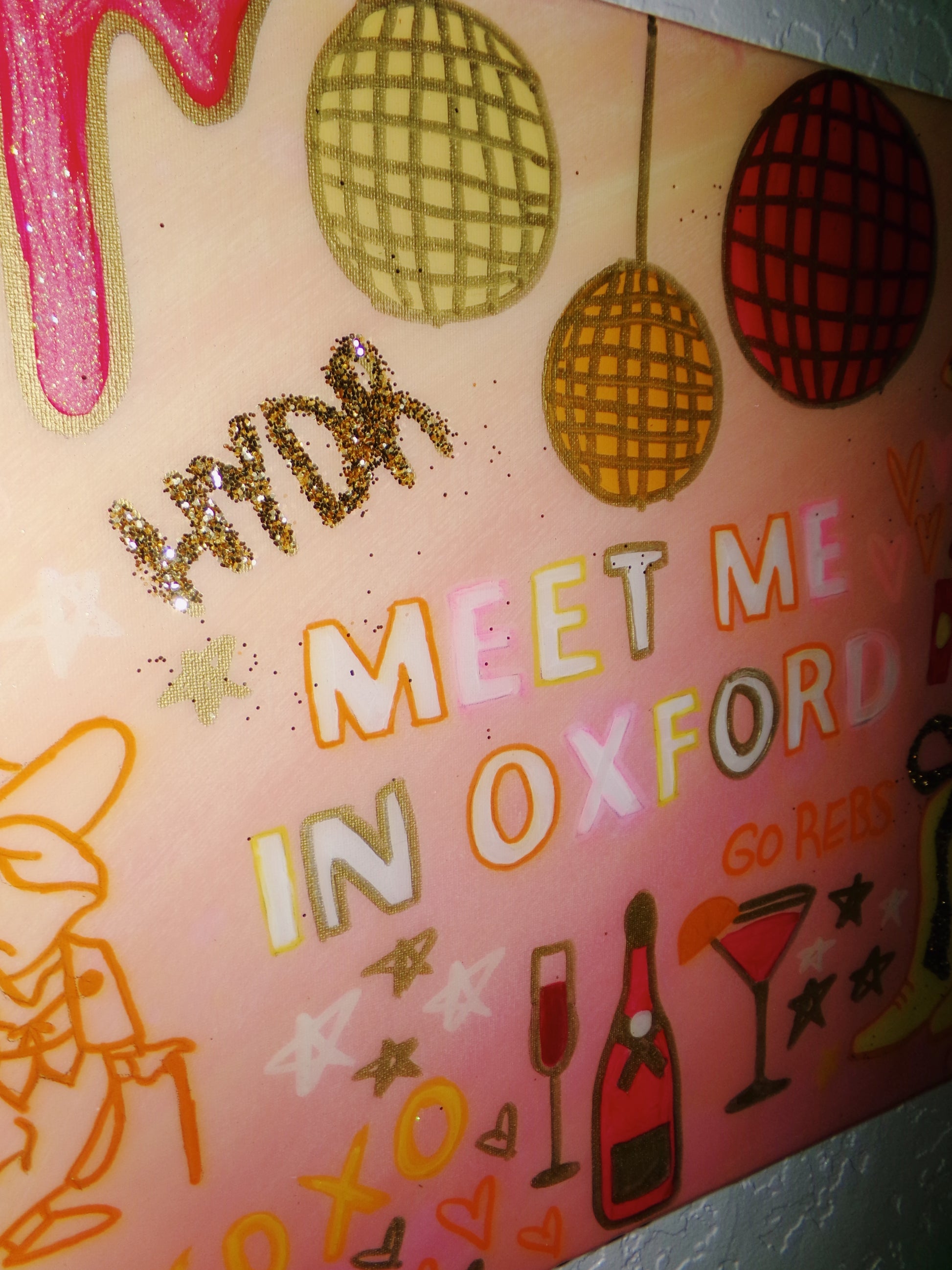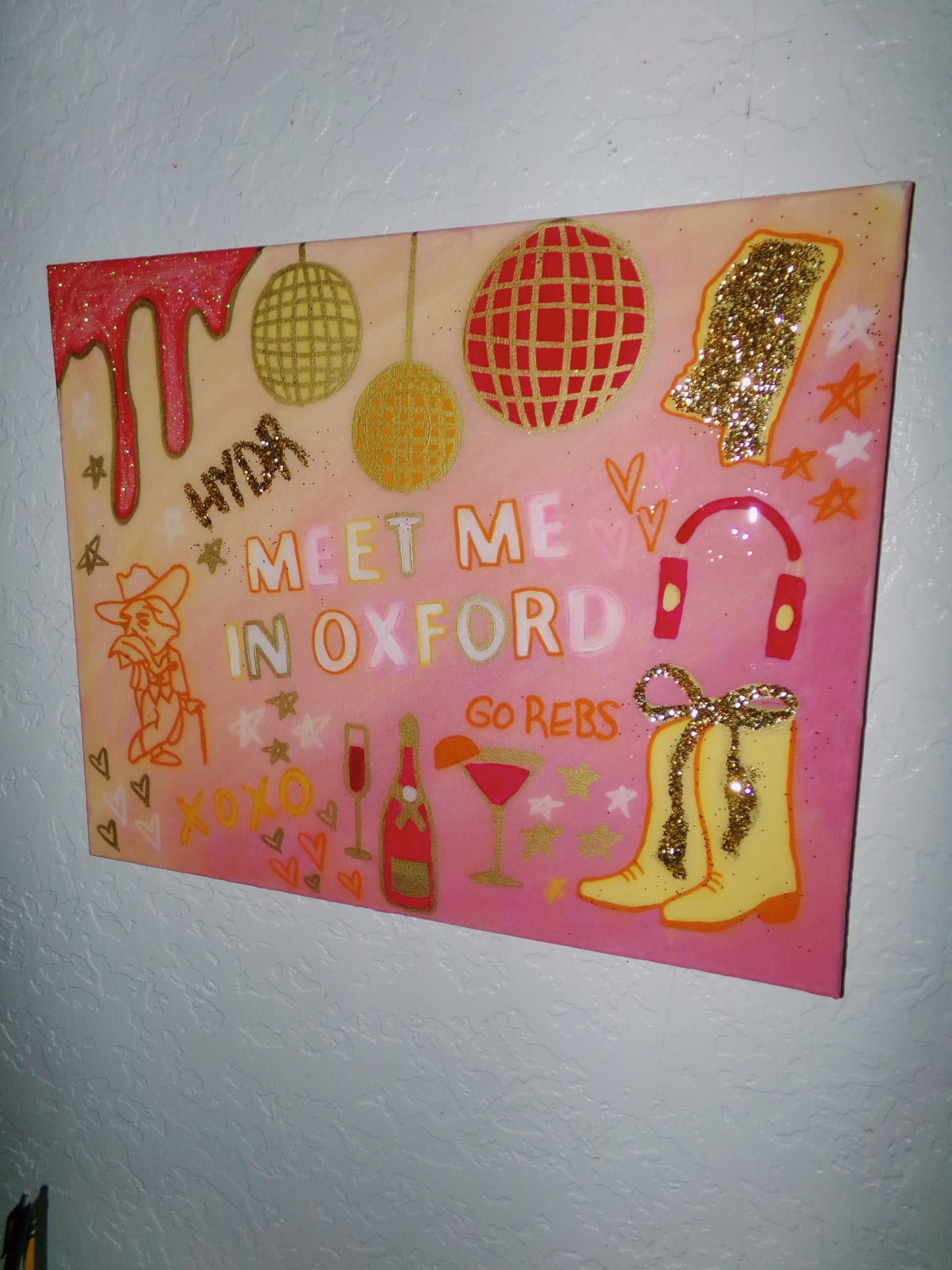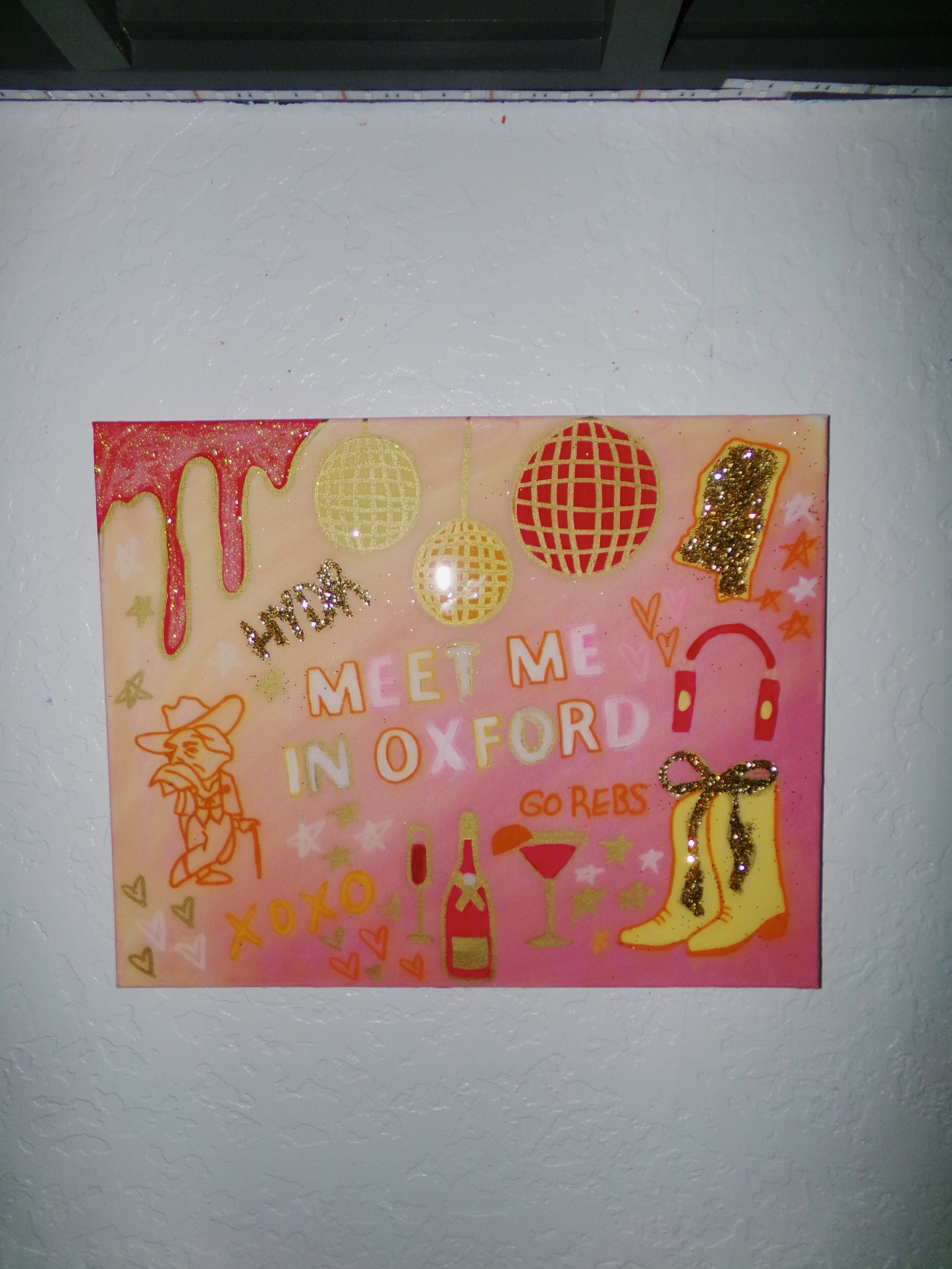 Get ready to add some prep to your space with our Meet Me in College Town Painting. This playful piece features a preppy vibe that will bring a touch of fun and whimsy to any room. Hang this painting to add a unique and quirky touch to your home decor.